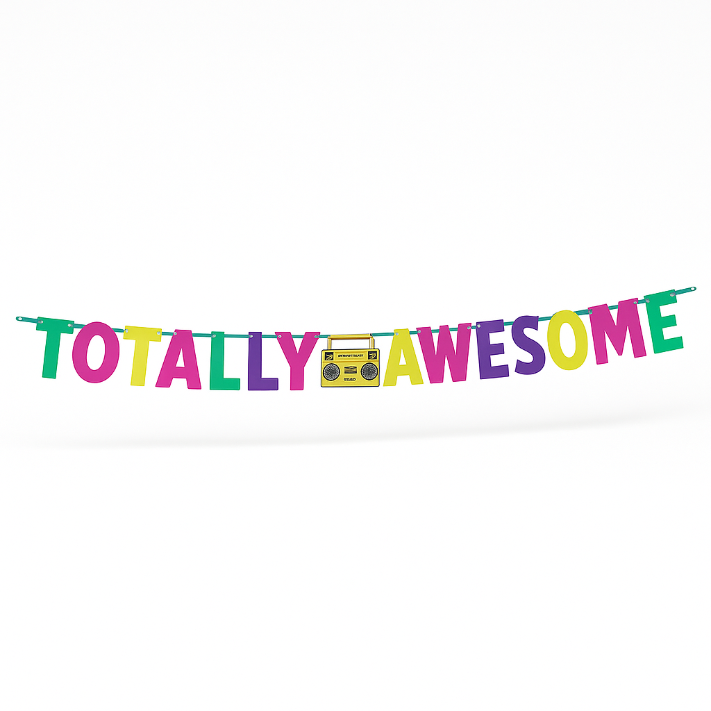 Take your party back in time with the Awesome 80s "Totally Awesome" Letter Banner. Perfect for any 80s-themed bash, this vibrant cardstock banner features the bold headline "Totally Awesome" with a playful boom box cutout in the center. Measuring 8.25 feet long, it includes 15 eye-catching cutouts that can be easily hung from ceilings, doorways, or walls. Add a rad, picture-worthy touch to your event with this must-have decoration!