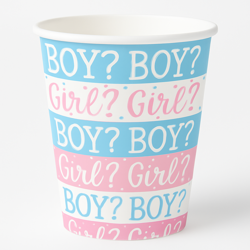 Celebrate the excitement of a new arrival with our Gender Reveal Paper Cups! Perfect for baby showers and gender reveal parties, these 9oz cups come in delightful shades of pink and blue, adding a playful touch to your gatherings. Made from sturdy paper, they are both practical and stylish, ensuring guests enjoy their beverages with ease. Coordinate with our matching party supplies for a cohesive look that will have everyone guessing in style!