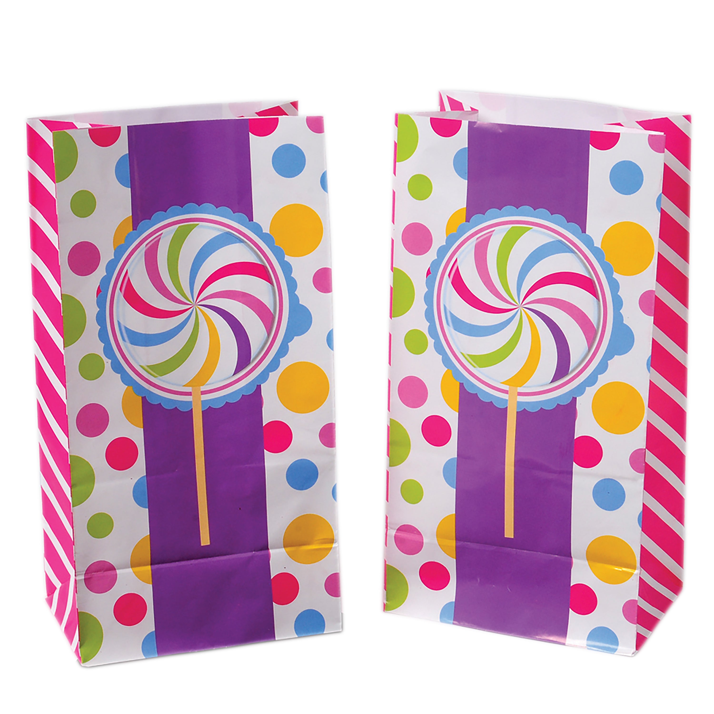 Make candy filled goody bags with these themed paper bags. Great for candy buffet parties, these bags are brightly colored with polka dots and stripes and a lollipop swirl that your guests won't soon forget!