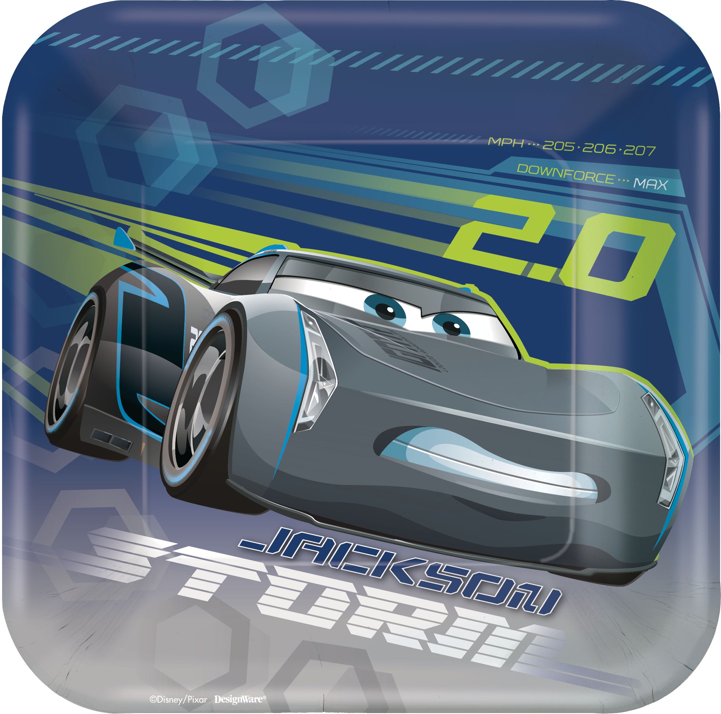 Rev up the fun at your child's birthday party with these Disney Cars 3 Square Dessert Plates. Featuring vibrant images of Jackson Storm and Cruz Ramirez, these plates add excitement to any celebration. Perfectly sized at 7 inches for serving cake and treats, each pack includes 8 plates with two dynamic designs. Ideal for young fans of the Cars series, these sturdy paper plates ensure easy and delightful party setup and cleanup.
